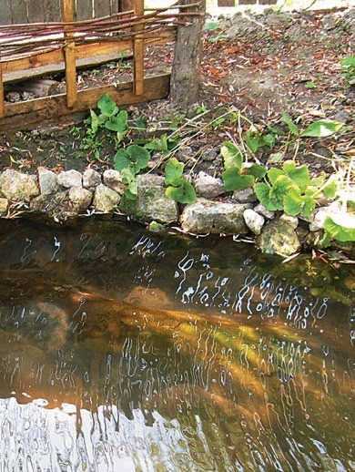 Циркуляция воды в пруду происходит за счет фонтана и водопада