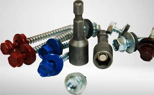 Саморезы с резиновой уплотнительной шайбой. Острый конец выполнен в форме сверла, что позволяет без дополнительного сверления закручивать их в металл толщиной 2 мм.