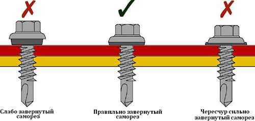 Правильное закрепление профлиста саморезом — он установлен в нижнюю волну