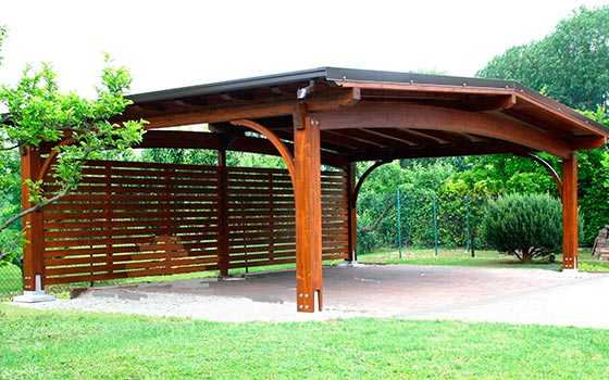 Закрытые типы навесов выполняются из различных материалов. Для стен используют стекло, пластик, фанеру, профильный металл, оцинковку, стекло, профнастил, сайдинг и другие материалы. Для остекленных закрытых навесов применяют алюминиевые раздвижные системы, которые являются прочными и прозрачными для обзора. Закрытые строения обеспечивают защиту от непогоды со всех сторон и позволяют находиться под навесом длительное время.