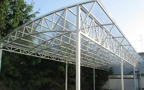 - Полигональные конструкции строятся для защиты больших площадей. Из-за сложной формы для облегченных навесов не применяются. Благодаря высокой прочности пролеты между фермами можно увеличивать, что уменьшает расход металла.