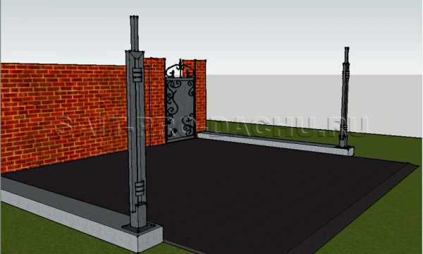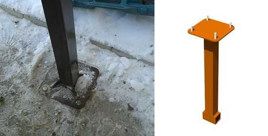 2. Подготовленную яму заполняют бетоном и устанавливают закладную деталь, к которой впоследствии приваривается вертикальная стойка.