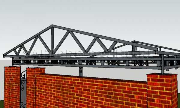 Основой навеса являются стропильные фермы, связывающие его в единое целое. Они изготовляются в виде горизонтальной пространственной конструкции, собранной из элементов, соединяемых сваркой. Ферма состоит из нижнего и верхнего пояса, скрепленных вертикальными и диагональными (раскосами) перемычками. Основным плюсом навесов из профиля является их способность при небольшом весе успешно противостоять ветровым нагрузкам и весу снега. Сварка ферм может быть выполнена из швеллера, уголка, но чаще выбираются профильные трубы.