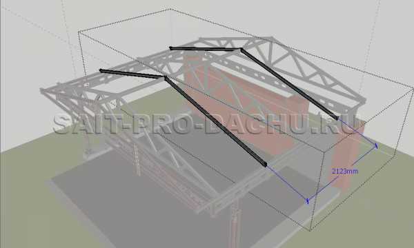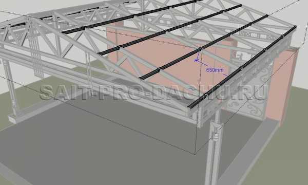 Чередование ферм по стене принимается по расчету. Если речь идет о небольших навесах, то принимается стандартное расстояние от одного к другому, равное одному метру. После установки ферм в монтажное положение к верхним стропилам приваривают обрешетку из квадратного профиля или уголка.