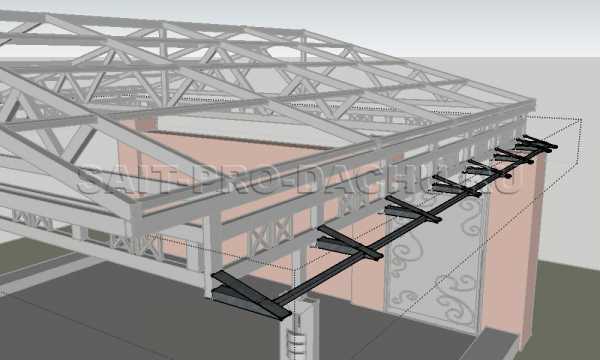 При изготовлении ферм их размер должен быть больше ширины навеса на 30–50 см. Это нужно для того, чтобы вода как можно меньше попадала на фундаменты и не приводила к их разрушению. Другим, более надежным вариантом является устройство отвода сточных вод с крыши навеса при помощи оцинкованных желобов или современных пластиковых систем.