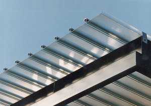 Навесы из металла очень выгодно и удобно покрывать поликарбонатом. Материал режется болгаркой в нужный размер, а затем наждачной бумагой проходят по краям поликарбоната, чтобы удалить неровности от порезки. Крепят материал к металлу саморезами или термическими шайбами. Поликарбонат при нагревании и остывании изменяет свои размеры, поэтому при креплении нужно оставлять небольшое свободное вхождение и обязательно ставить резиновую прокладку между материалом и метизом.