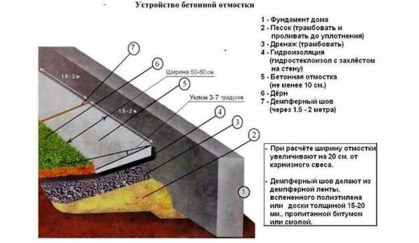 - ширина бетонной дорожки. Ее минимальный размер не должен быть меньше 60 см. Увеличение ширины до 1 м позволит комфортно перемещаться вокруг здания;