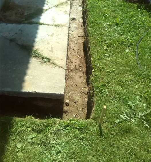 Всё, теперь в траншею устанавливаем желоба, тут важно что бы они плотно прилегали к отмостке, и заливаем бетоном (бетонируем желоба).