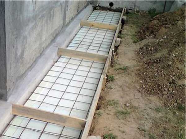 Опалубку следует сделать из досок и корректно, строго по размерам, закрепить по периметру. Можно сделать упоры прямо в фундамент постройки и стенку по периметру углубления. Главное, чтобы опалубка смогла выдержать давление материалов и не рассыпаться.