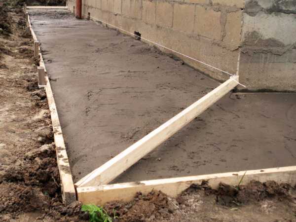 Сразу хотим напомнить о температурных швах или просто частях опалубки, которые могут служить своеобразными маяками уровня и уклона поверхности. Обратите на них особенное внимание. Если дерево останется в отмостке, обработайте его предварительно антисептическими средствами!