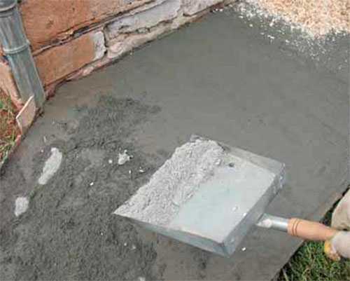 Для этого нужно спустя 15-20 минут после заливки бетонной смеси посыпать покрытие сухим цементом и выровнять шпателем или мастерком.