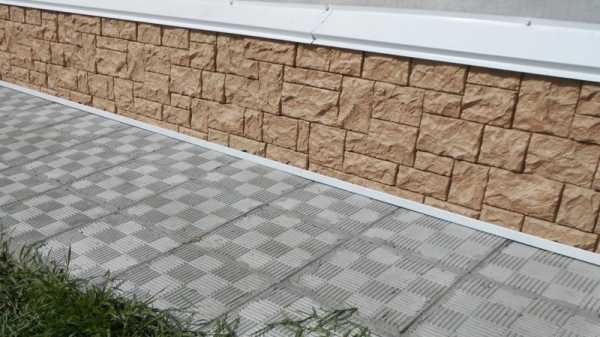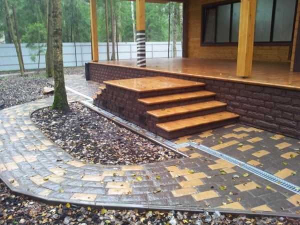 По аналогичной схеме сооружают отмостку вокруг дома из плитки или брусчатки. Правда, здесь необходимо учитывать ряд нюансов. Из-за присутствия уклона высока вероятность того, что плитка будет съезжать. Решается этот вопрос очень просто — для этого устанавливают бордюрный камень.