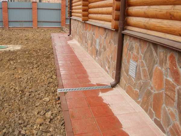 Снижение отмостки идет от бани, стандартный уклон – 3-5 градусов. Традиционно одновременно с ней делается ливневый отвод по периметру.