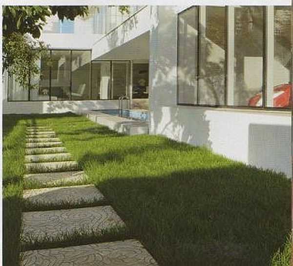 - Чтобы сделать красивую отмостку, следует не доходить до уровня почвы несколько сантиметров. Это пространство отмостки заполняют рулонной травой.
