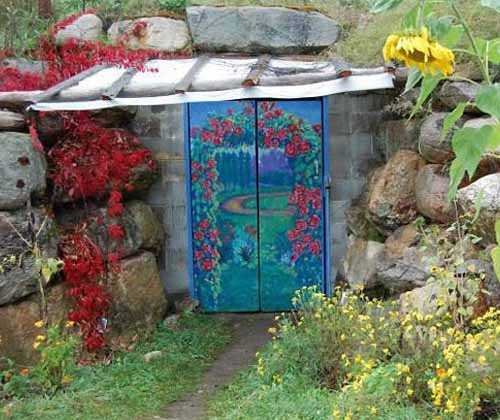 Вариант с люком простой, но не очень удобный, так как спускать по такой лестнице мешки с овощами проблематично. Кроме того, это еще и очень опасно. Чтобы создать максимум удобств, необходимо сделать полноценную дверь с наклонной пологой лестницей в хранилище. Такой вход может даже стать украшением вашего участка, если приложить немного дизайнерской фантазии.