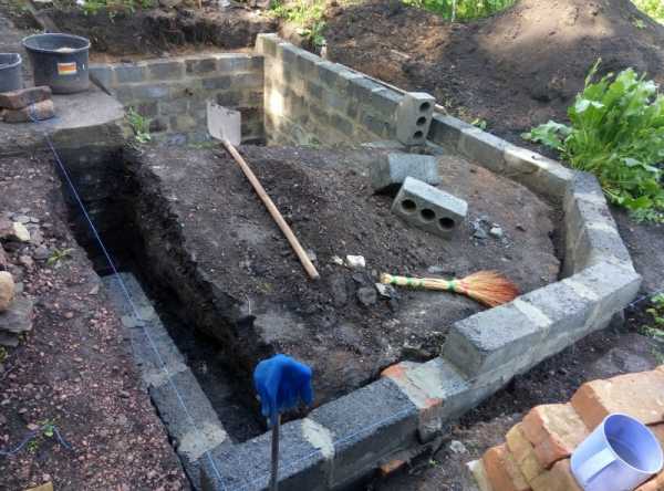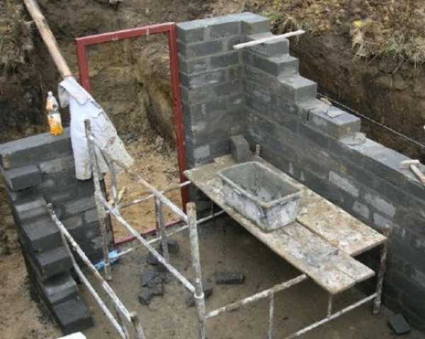 - Материал для строительства стен необходимо выбирать правильно, например, если это бетонный материал, он должен иметь повышенные водонепроницаемые свойства (читайте Бетонные блоки для стен подвалов: кладка своими руками — руководствуемся СНИП). Применение бетона или кирпича, как показано на фото, обязательно требует их обработку специальными составами, сделать с двух сторон качественную цементную стяжку, стены отделать защитными материалами, например, рубероидом.
