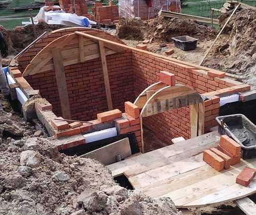 В начале работ вылаживаются углы погреба их ровность контролируется отвесом и уровнем. На следующем этапе проводиться кладка стен.