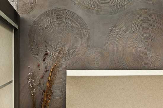 Фактурная декоративная штукатурка. Отличается своей пластичностью. Благодаря ей можно имитировать гладкую рельефную поверхность, делать различную фактуру и всяческие узоры. При этом работать можно с обычной финишной штукатуркой, придавая ей искусный вид. Поверхность можно покрасить и сделать весьма оригинальной.