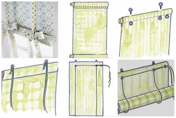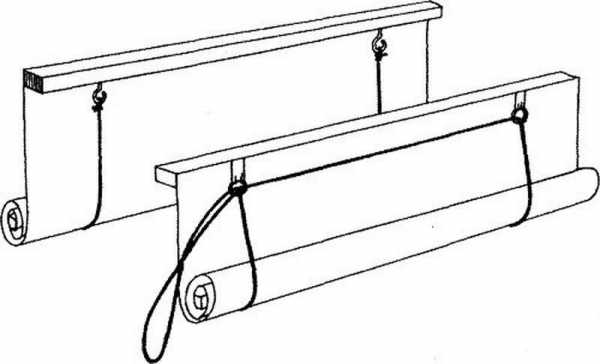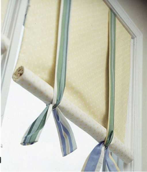 Через верх перебрасывают подготовленную тесьму или ленту. Сверху ее закрепляют. При поднятии, шторы наматываются на нижнюю рейку и фиксируются на выбранной высоте.