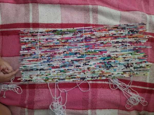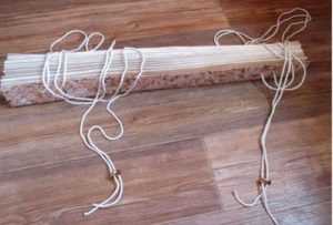 Некоторым нравятся жалюзи, которые похожи на продающиеся в магазинах. Их изготовление во многом похоже на описанный выше процесс. Единственная разница заключается в том, что отверстия прокалывают не посередине, а с двух сторон, на одном расстоянии. Соответственно продевают два шнура, фиксируют их специальным приспособлением для регулировки.