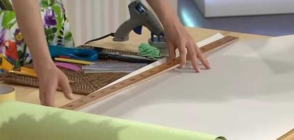 Далее требуется перенести все замеры на обои, разрезать и склеить поверхности по высоте. Рассмотрим на фото весь процесс изготовления своими руками рулонных жалюзи из обоев.