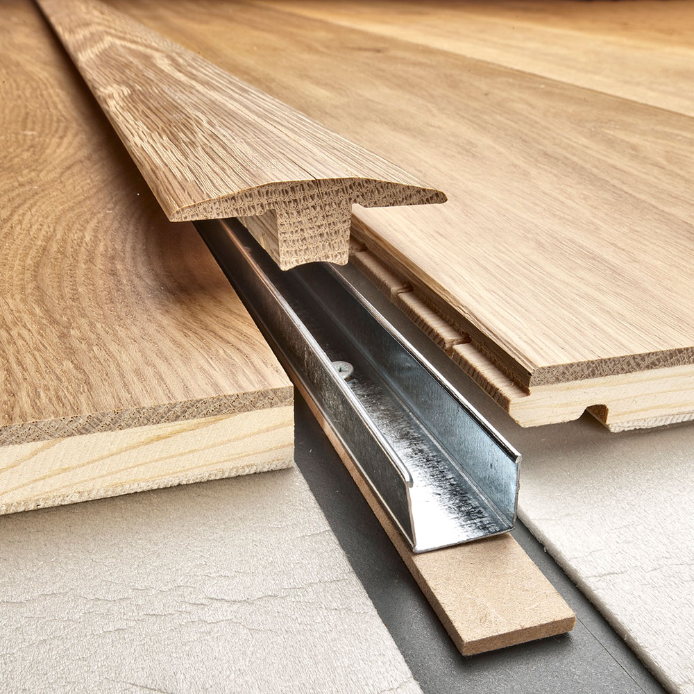 Как стыковать ламинат, чтобы шов был минимально заметным? Используя ламинированные стыковочные профили. Их делают из алюминиевого сплава или МДФ, покрывают пленкой, которой покрывают ламинат. Состоят соединительные профили для ламината из направляющей и декоративной планки. Направляющая может быть пластиковая или металлическая.