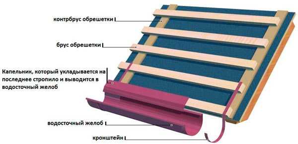 Обрешетку нужно монтировать поверх гидроизоляционного слоя. Основная доска обрешетки, которая крепится в самом низу параллельно карнизу, имеет большую толщину, чем остальные элементы. По торцам крыши нужно установить ветровые доски, которые должны находиться выше, чем другие элементы обрешетки на высоту профиля.