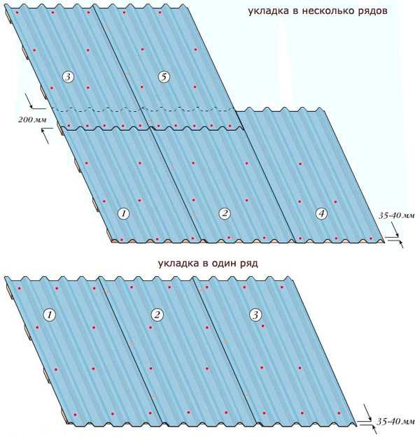 - при креплении верхних листов надо делать нахлест на нижние элементы, причем минимально данный нахлест равен 20 см;