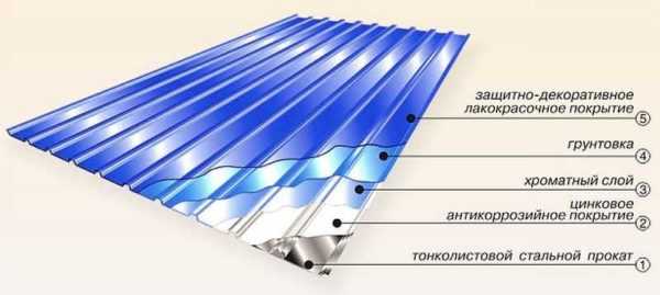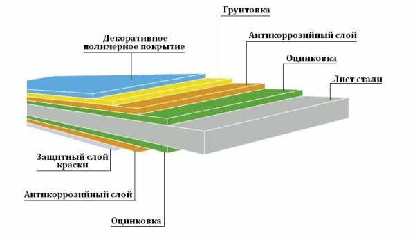 - Долговечная коррозионная стойкость. Типовой профилированный лист представляет собой многослойную конструкцию, где сталь является только основой для общей прочности. На сталь наносятся полимерные и цинковые покрытия, стойкие к механическому и химическому воздействию лаки и напыления;