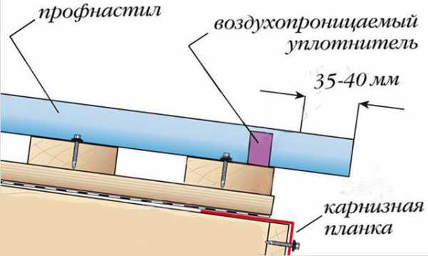 Для того чтобы обшить свес профлистом, к фронтальной доске крепят специальный профиль. В его паз вставляется профлист, нарезанный на полосы нужной ширины. Второй край подшивки крепится к доске, прибитой к концам стропил. Стык подшивки и доски закрывается двумя капельниками — один прибивают снизу, закрывая нижнюю половину доски, а второй — сверху. На него затем укладывают край гидроизоляционной пленки.