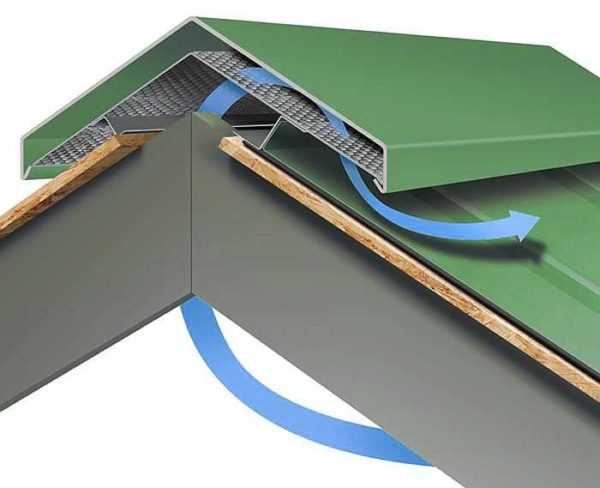 Если специальные коньки с вентиляцией (на фото), но даже если просто установить обычный коньковый элемент, между профлистом и его краем, получается большое количество отверстий — в каждой впадине гофры. Величина этого зазора зависит от высоты волны — чем выше волна, тем больше получаются зазоры. На свесе, там где прибивается фронтальная доска, также есть аналогичные отверстия. Движение воздуха обычно идет снизу-вверх — от свеса, через подкровельное пространство (для этого обязательно при монтаже кровельного материала оставляют вентиляционные зазоры, которые формируются обрешеткой), к щелям в коньке. Так и происходит вентиляция и регуляция влажности утеплителя, испаряется и уносится конденсат.