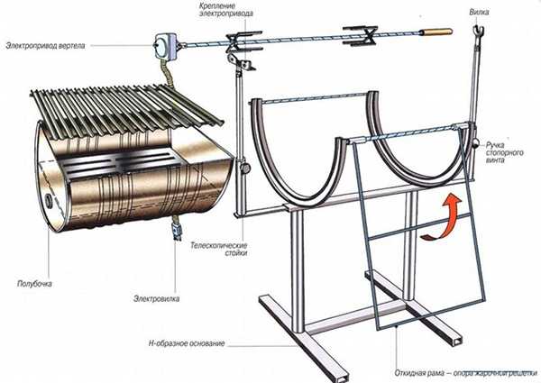 Вот, кстати, нашел схему, как сделать обычный мангал из бочки. Нарисовано все понятно и доступно, боюсь только, сделать такую подставку своими руками без сварочного аппарата проблематично. Но все равно, может, пригодится.