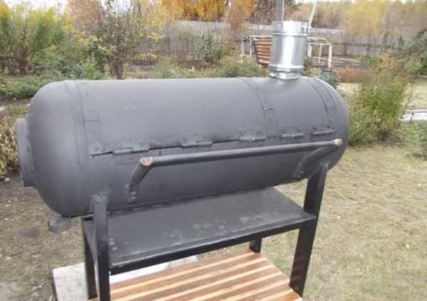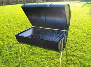 Давайте рассмотрим, как сделать вот такую стационарную конструкцию из металлической бочки, с крышкой, вытяжкой, в общем, все как положено. С изготовлением придется немного повозится, но если делать на заказ, то будет стоить очень дорого. Итак, будем считать, что болгарка и прочие инструменты у вас есть, так что начнем.