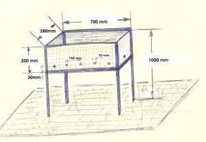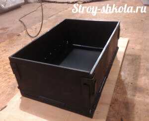 - Сделайте разметку на листе металла и сварочным аппаратом или болгаркой обрежьте все лишнее. Согните лист по разметке под прямым углом. Крайние поверхности сварите по всей длине, к ним приварите дно. Чтобы ножки легко снимались при необходимости, их лучше закрепить на болтах. К тому же это сэкономит место во время транспортировки.