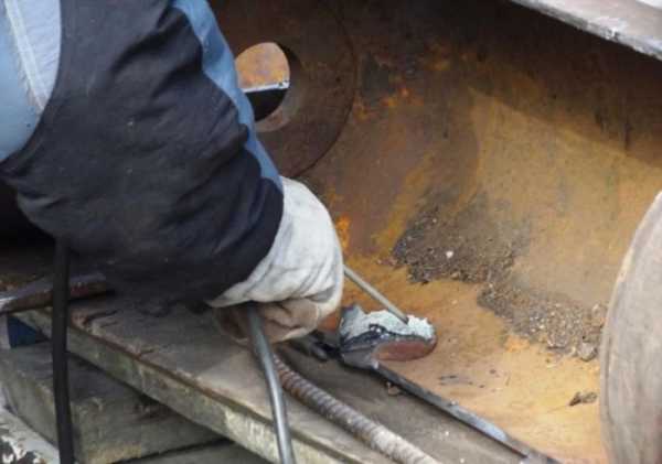 2. Из металлических уголков делаем ножки для мангала. Разрезаем уголки на четыре одинаковых части и привариваем их к торцевой части бочки.