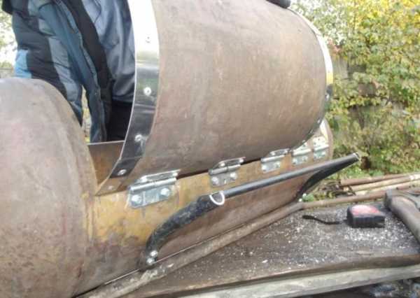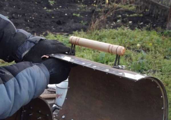 4. К крышке необходимо приварить металлические петли и две ручки. Это защитит мангал и угли в случае начавшегося дождя.