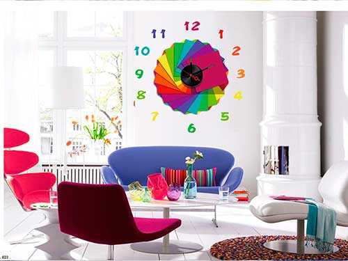 В современном интерьере популярно использование стрелочных часовых механизмов, которые крепятся непосредственно к стене. При этом циферблат вы можете создать самостоятельно, нарисовав или наклеив цифры на стену, развесив по кругу 12 картинок, фотографий или любых других предметов, сочетающихся по стилю и цветовой гамме. Такой вариант декора позволяет создать уникальную композицию, которая может занять практически всю стену.