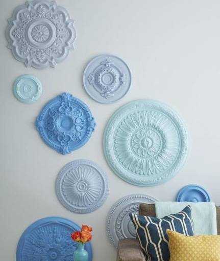 Очень оригинально смотрятся на стене декоративные элементы из полиуретана для потолка. Вы можете покрасить их в любой цвет,исходя из цветовой гаммы вашего помещения. Разместите на стене медальоны разные по форме и размеру.Декорировать стены такими деталями можно в любой комнате дома.Коллекция станет необычной изюминкой помещения.