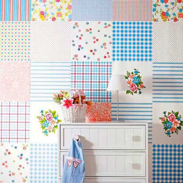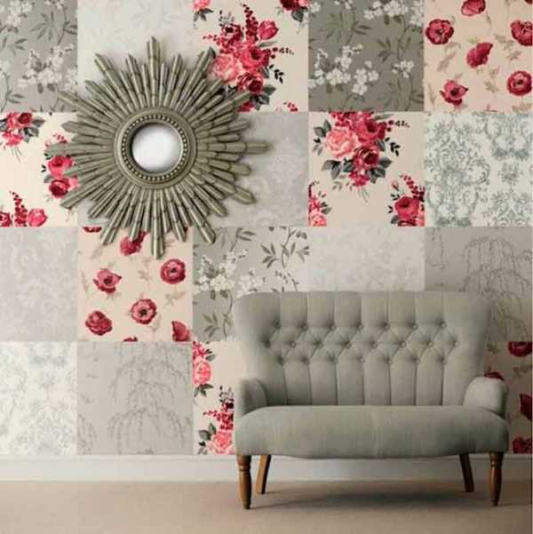 Чтобы преобразовать пространство в комнате обои можно расположить в определенном порядке. Важно правильно подобрать цвет и орнамент используемых лоскутов.