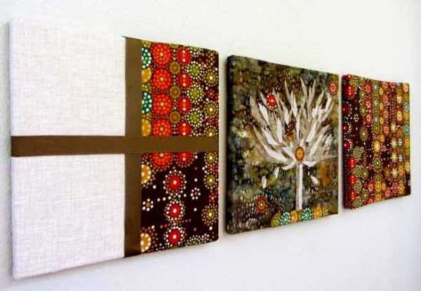 Композиции можно создавать из разных материалов, схожих цветовой гаммой, или из одной ткани с броским рисунком. Тканевые картины должны быть одинакового размера, а вот строгую симметрию развешивания соблюдать не обязательно – их можно развесить в хаотичном порядке.Еще одна интересная идея в копилку «как украсить стену в комнате» — создание репродукций из платков. Яркие, красочные картины из платков станут эстетичным оформлением гостиной, спальни, детской, вызывая восхищение своей оригинальностью.