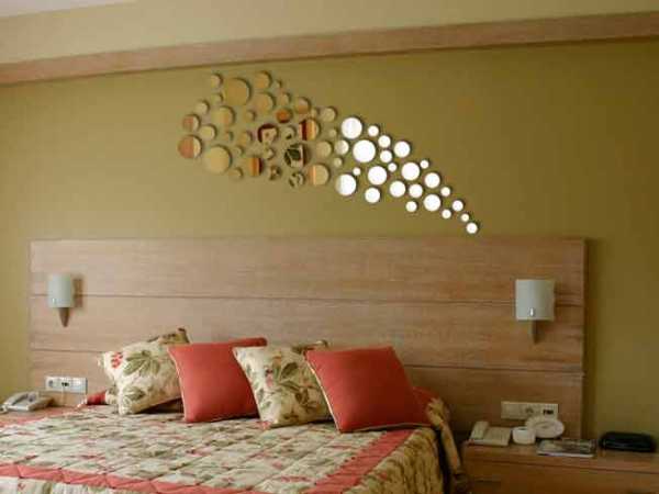 Еще один популярный вариант – создание композиции на стене при помощи небольших круглых зеркал различного диаметра или плоских зеркальных фигурок (бабочки, нотные знаки, листья и т.д.). Тыльная сторона таких декоративных элементов обычно снабжена клейким слоем и их без труда можно повесить на стену. Подобная композиция из множества мелких элементов станет прекрасным дополнением к круглому или овальному зеркалу на стене или подходящим по стилю часам.
