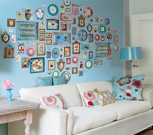 Красиво будут смотреться на стене картины и иллюстрации. Превратите ее в галерею, только располагайте картины асимметрично – так будет интереснее. Повесьте в центр стены пару крупных рам, а вокруг них создайте композицию из небольших картинок.