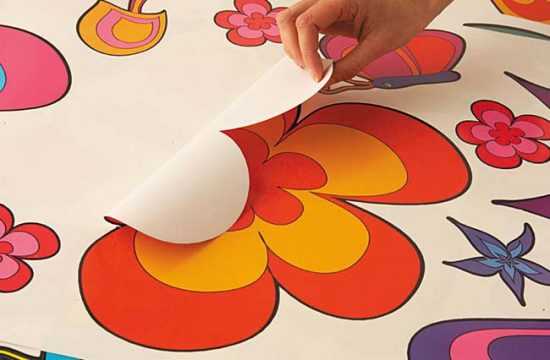 - Если наклейка маленькая, полностью снимите подложку, а оставшийся принт приложите к стене и аккуратно разгладьте от центра сухой мягкой тканью. Потом снимите защитное покрытие. Если же стикер большой, выполните следующие действия: немного отверните подложку по верхнему краю; закрепите защитную пленку на стене; начинайте аккуратно тянуть подложку вниз, вытягивая ее из-под принта, и параллельно разглаживайте наклейку; снимите защитную пленку.