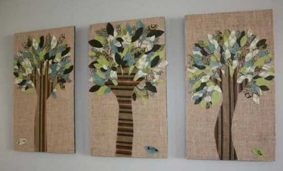 Можно создать оригинальное панно из подручных материалов, которые когда-то были «хобби». Это могут быть марки или сотни открыток. Уникальные изображения получаются из наклеенных на холст веток, засушенных цветов или бисеринок.