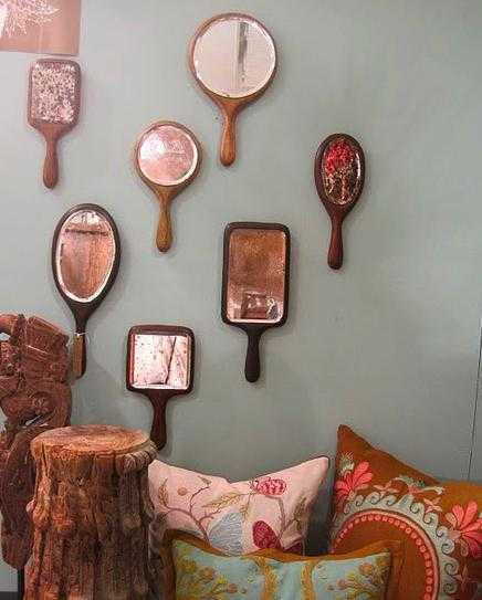 Зеркала станут прекрасным украшением стены, если использовать их нестандартно. Можно при помощи разнообразных материалов изготовить обрамления для круглых и овальных зеркал различных размеров и развесить их на стене, создав оригинальную композицию. Проще всего изготовить обрамление из декоративного шнура, аккуратно закрепив по краю несколько витков при помощи термопистолета.