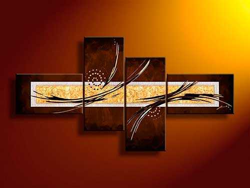 Украшением стены станет и коллаж из небольших картинок (принцип подбора и размещения – как у фотографий). Если дизайн комнаты выполнен в стиле хай — тек или минимализма, для ее оживления прекрасно подойдет абстрактная живопись.