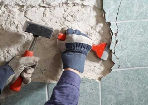 Если стены уже были отделаны плиткой, материал нужно удалить с поверхности при помощи молотка и стамески. Ускорить процесс демонтажа можно при помощи перфоратора со специальной насадкой. Старую краску или обои удаляют со стен при помощи шпателя. Если на поверхности имеется слой старой штукатурки, на которой есть вздутия, трещины, это говорит о ее плохом сцеплении со стеной. Такую отделку также нужно удалить, а возникшие дефекты стены – заделать.