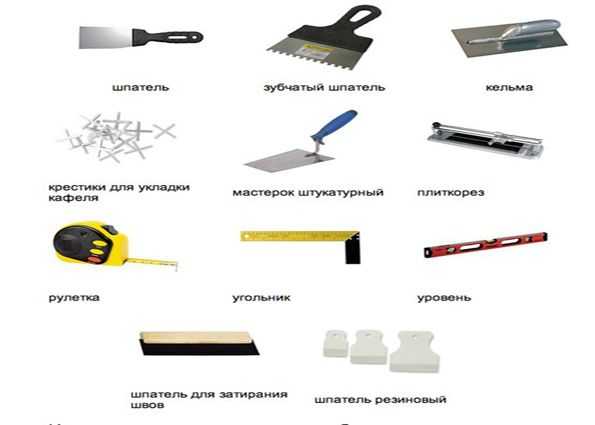 Зафиксировав надежно основание, можно укладывать первый ряд кафеля на предварительно замешанную с соблюдением указанных на упаковке пропорций клеящую смесь. Для выполнения облицовки понадобятся такие инструменты: