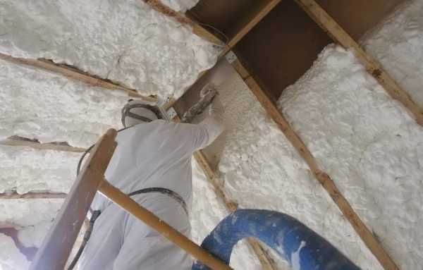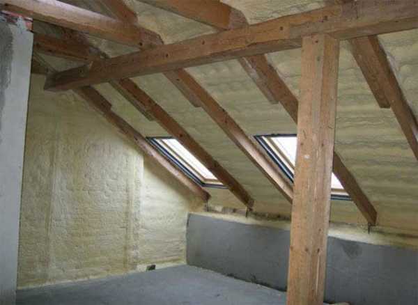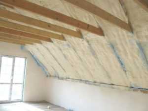 Пенополиуретан отличается от предыдущих вариантов способом укладки. Благодаря этому не остаётся щелей. Материал отлично сохраняет форму. Обладает необходимой пожаробезопасностью и отталкивает влагу. Недостатком пенополиуретана считается плохая способность пропускать пары. Из-за этого в мансардном помещении может быть повышенная влажность. Проблема решается организацией адекватной вентиляции.