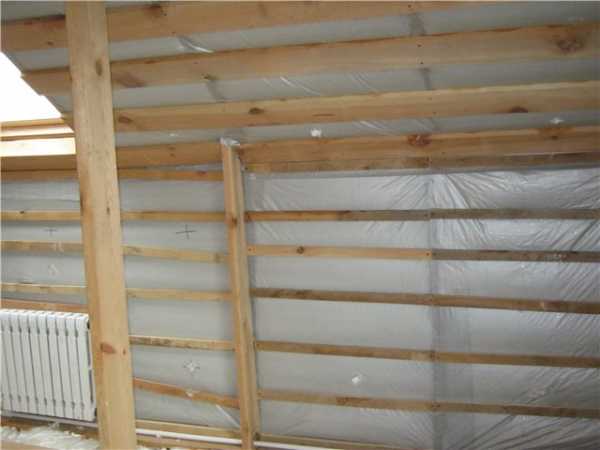 - 6. Уложенный полностью утеплитель покрывается пароизоляционным материалом, укладывающимся внахлест, а все стыки также проклеиваются. Что касается крепления пленки, то оно производится путем использования обрешетки либо скоб.